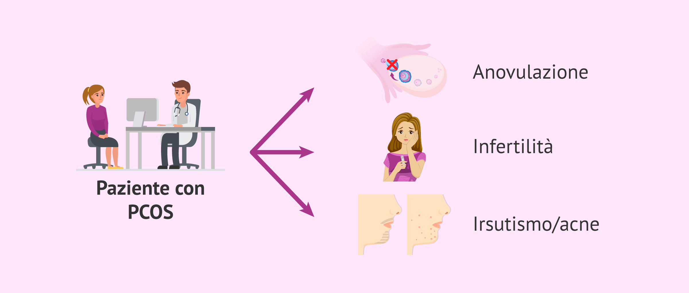 La sindrome dell'ovaio policistico (PCOS) è un disturbo endocrino che si presenta con una certa frequenza tra le donne in età riproduttiva. Alcuni dei suoi sintomi possono essere irregolarità mestruali (come l'anovulazione), problemi di fertilità, aumento dei peli corporei (irsutismo) e alcuni problemi come l'acne.
