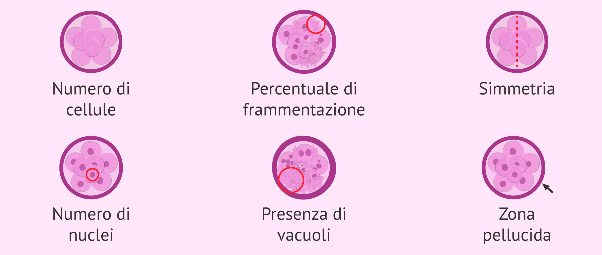 Gli embrioni vengono classificati in base alle loro caratteristiche morfologiche e cinetiche. Pertanto, durante la coltura embrionale, il personale del laboratorio si occupa di analizzare i seguenti parametri embrionali per classificare gli embrioni: